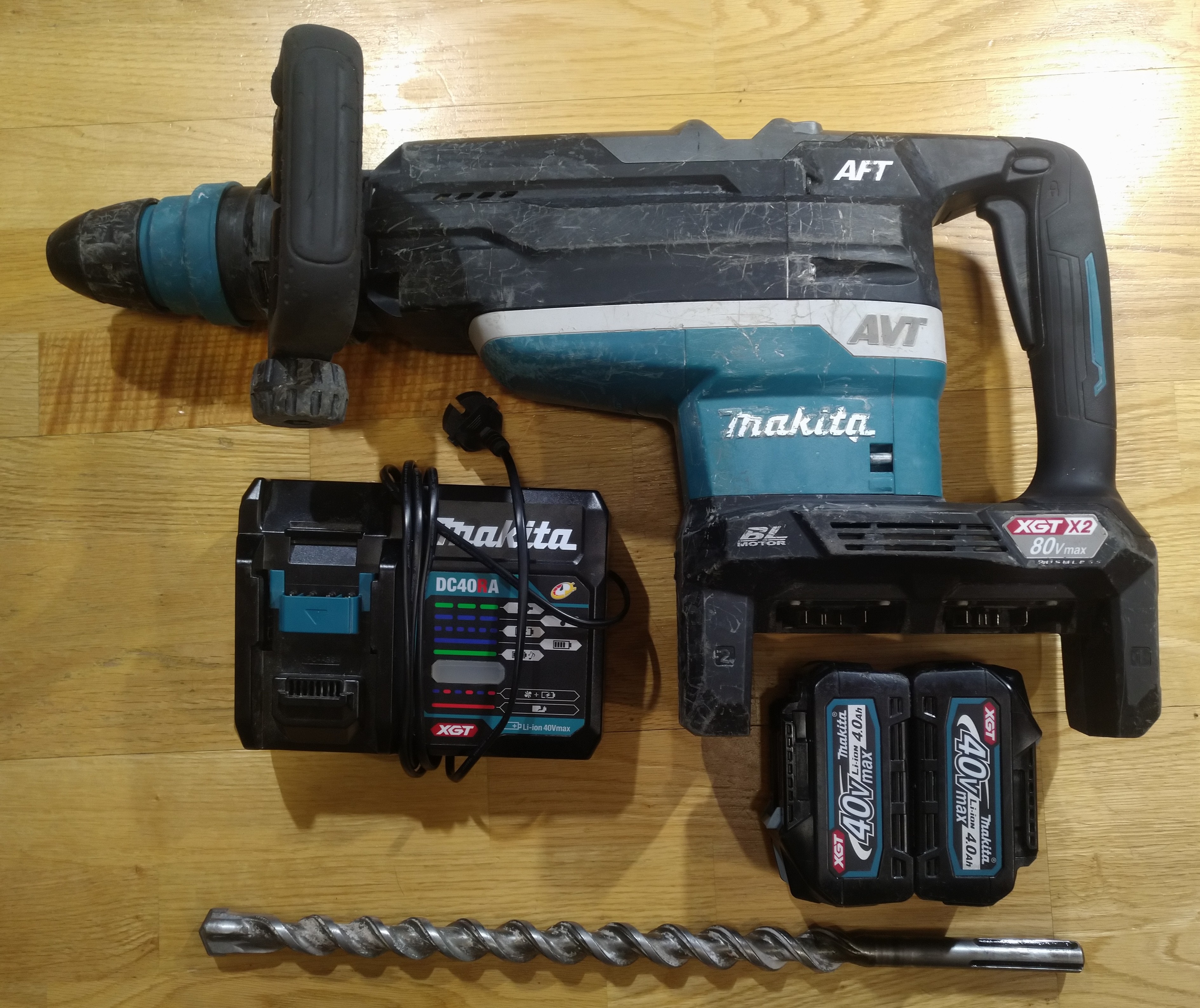 Akkukäyttönen järein Makitan tekemä poravasara. Referenssiksi toi kuvan terä on 28mm/400 kanki. (400 "kierrettä" ja koko pituus 520). Syö noita 40V akkuja kahta yhtäaikaa, ni tästä löytyy löylyä. Tää on kombivasara, joka tarkottaa, että joko terä pyörii ja hakkaa tai sitten vaan hakkaa. Pelkästään porata/pyörittää ei voi. Tossa piikkausmodessa terä lukitaan haluttuun asentoon, esim. petkeleellä voi takoa laattoja irti. Fjongansäätö, et kuin paljon tää lyö. Jos jotain heti sotien jälkeistä "betonia" takoo tarkasti, ni ehkä tota tehoa pitää tiputtaa ja jos urakalla pitää lattiakaivo saada esiin tai luonnon kiveen reikä, ni sit tietty täysille.